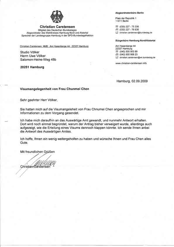 Mit dem Besucher-Visum für Frau Chen bin ich auch nicht weiter gekommen trotz neuer Unterlagen und einem kurzem Gespräch mit einem Herrn Werner aus der Visa-Abteilung, er machte uns Hoffnungen in dem er eine Flugbestätigung haben wollte, die ich im Moment natürlich nicht bei mir hatte. Das Problem war schnell durch ein Telefongespräch mit der Reiseagentur geklärt und die Bestätigung war geklärt. Aber auch dieser Visum-Antrag wurde abgelehnt, wie immer ohne Begründung also remonstrieren! Ich war dann noch einmal in der Botschaft um die Begründung zu erfahren, ich versuchte ein Gespräch mit Herrn Krems zubekommen Herr Krems war wie immer nicht ansprechbar aber Herr Werner, ich habe ihm deutlich gemacht was ich von dieser Ablehnung hielt, mit der Antwort das er darüber nicht weiter Informiert sei, aber er werde sich darum kümmern und mir die Begründung zu Faxen.