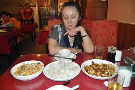 Das Nationale Grand Theater erstrahlt in den Nachtstunden von Blau über Weiß, auch alle Parteigebäude erstrahlen in einem Meer von Licht. Laufen macht bekanntlich hungrig und so sind wir dann in ein kleines Restaurant, in der “N Xinhua Street” gegangen, welches wir schon einige Male aufgesucht hatten und immer zufrieden waren. Egal was wir bestellten, es war zu viel. Der Gesichtsausdruck von Chunmei sagt alles. Wohin mit dem ganzen Essen? Aber es gab ja die Dogy Bags zum mitnehmen. Ich trank wieder ein schönes kaltes Tsingtao-Bier. Nach dem ausgiebigen Essen sind wir dan ins Hotel zurück und haben unsere Koffer gepackt; denn wir wollten am nächsten Tag mit dem Flieger nach Qingdao fliegen, der ehemaligen Deutschen Kolonie in China.